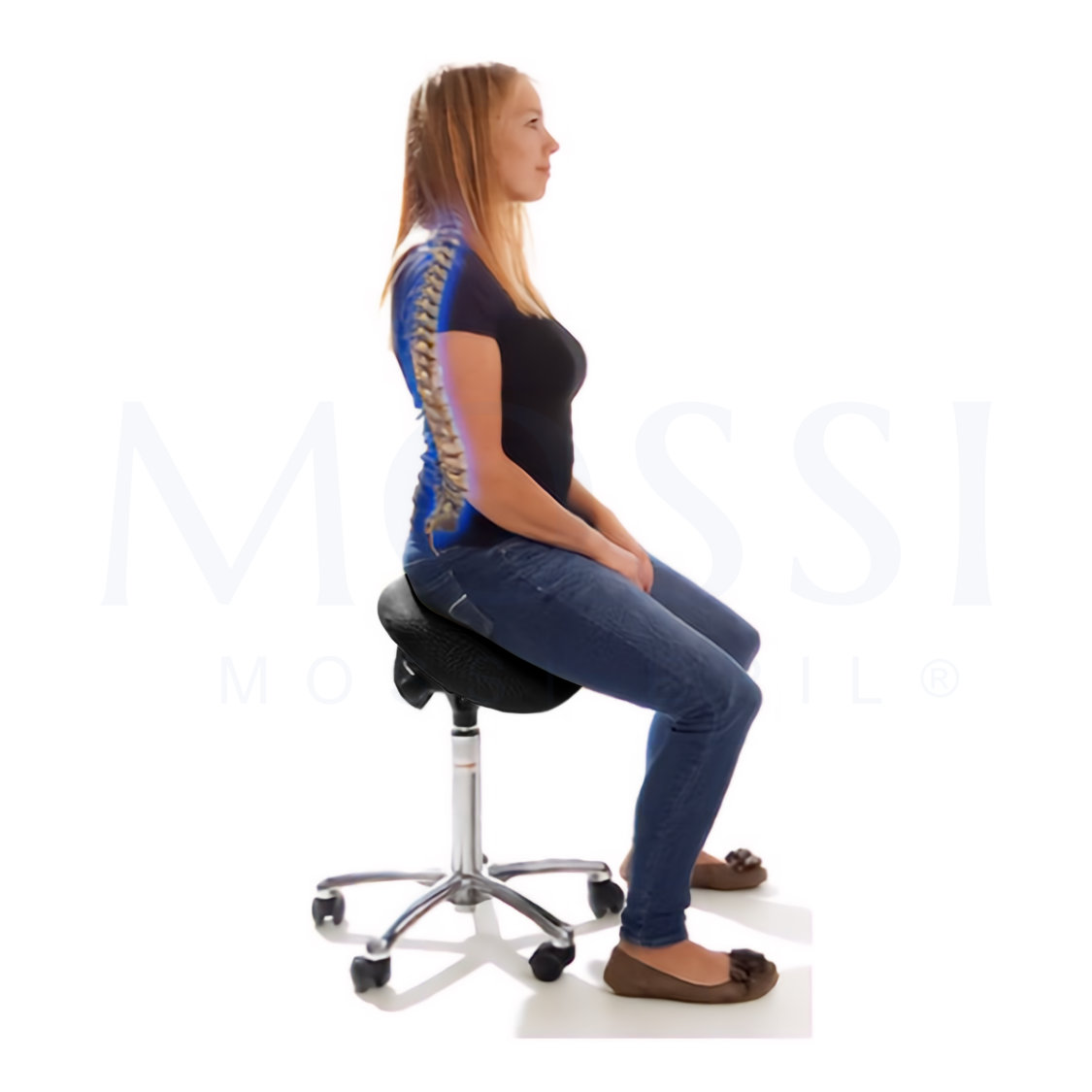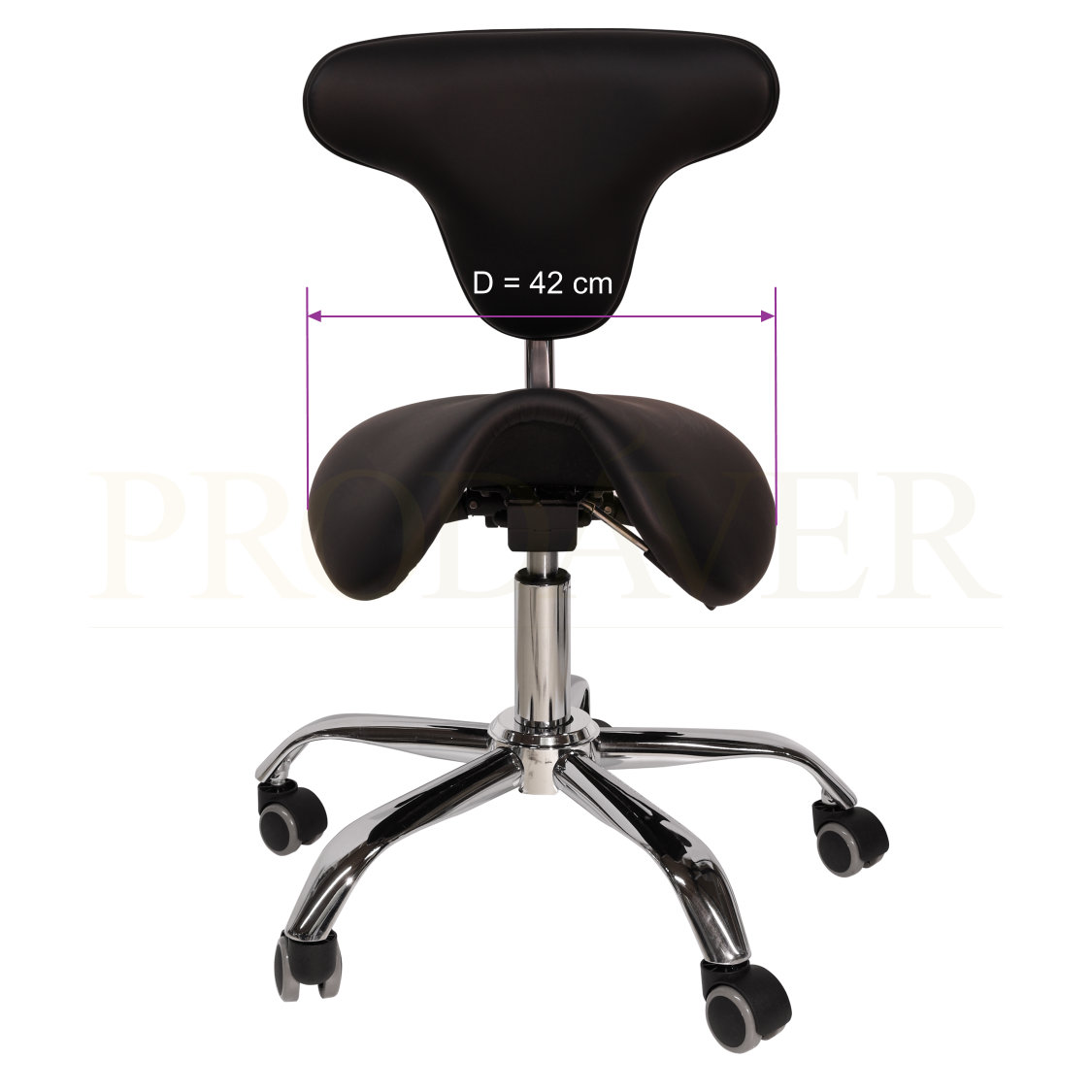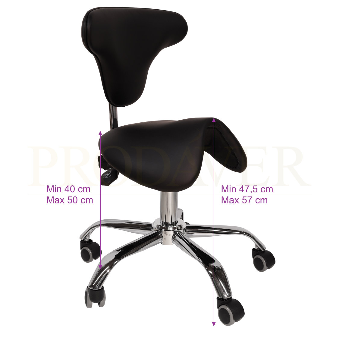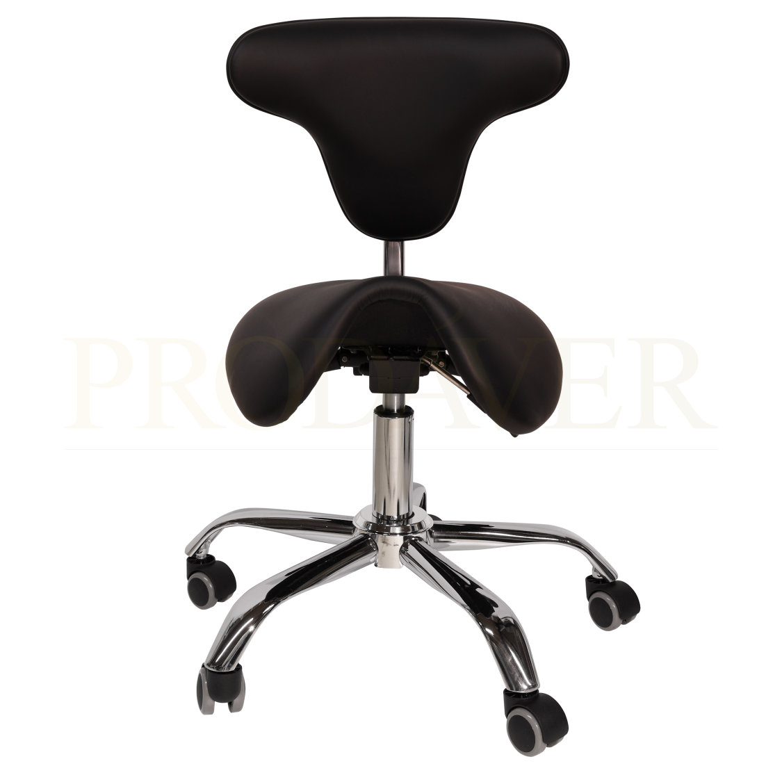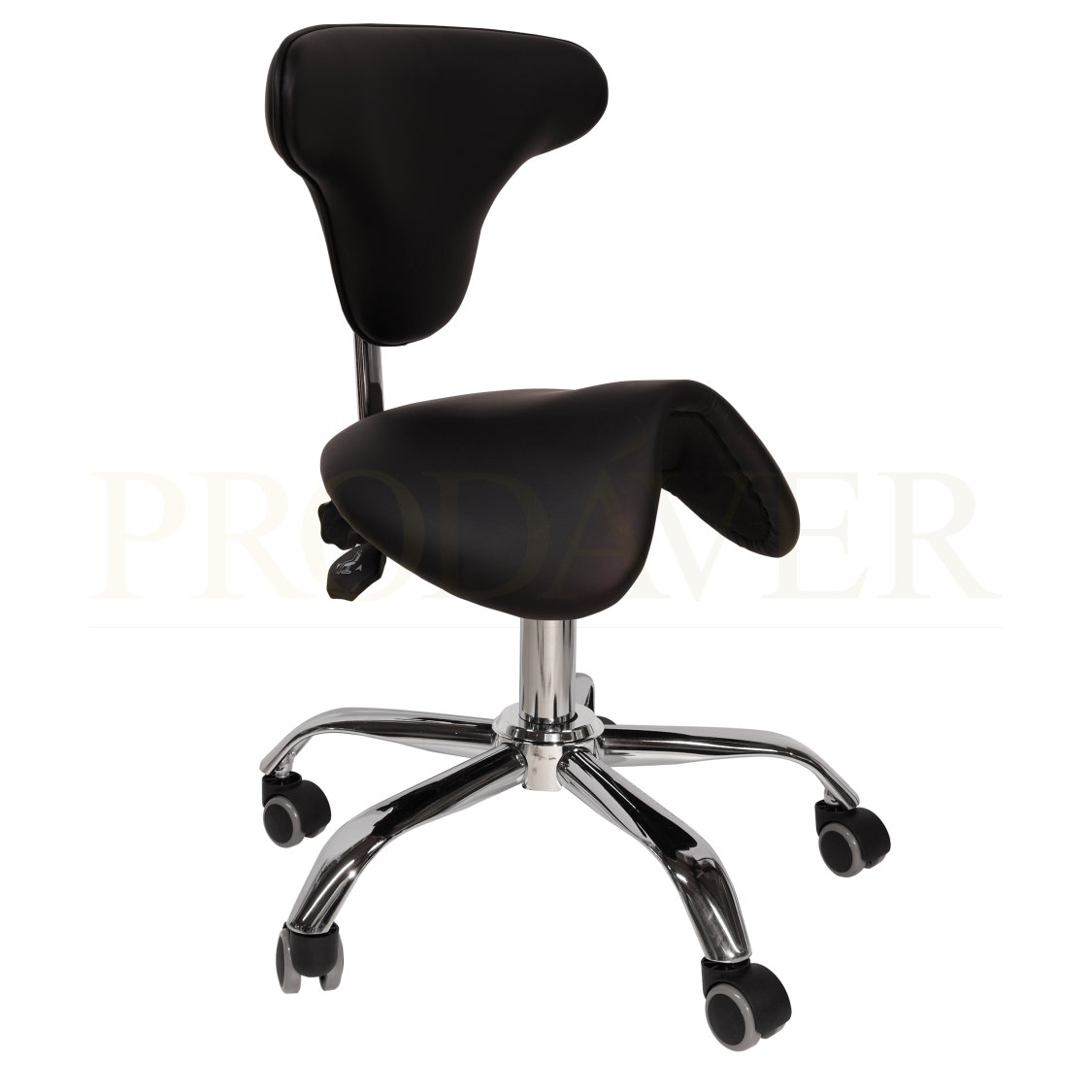Banco de sela hidráulico. Contém três patilhas: a primeira para elevação, a segunda para declinar a ponta da frente do banco, caso o/a profissional esteja a trabalhar inclinado para a frente e ainda a terceira para reclinar o encosto das costas na posição desejada. O encosto tem um formato curvado para contornar o dorsal e pode ser ajustado, por aperto feito manualmente. Este banco tem uma sela um pouco mais larga do que o banco de sela sem encosto. Napa de PVC. Base do banco cromada, consiste de 5 "braços" com as respetivas rodas.