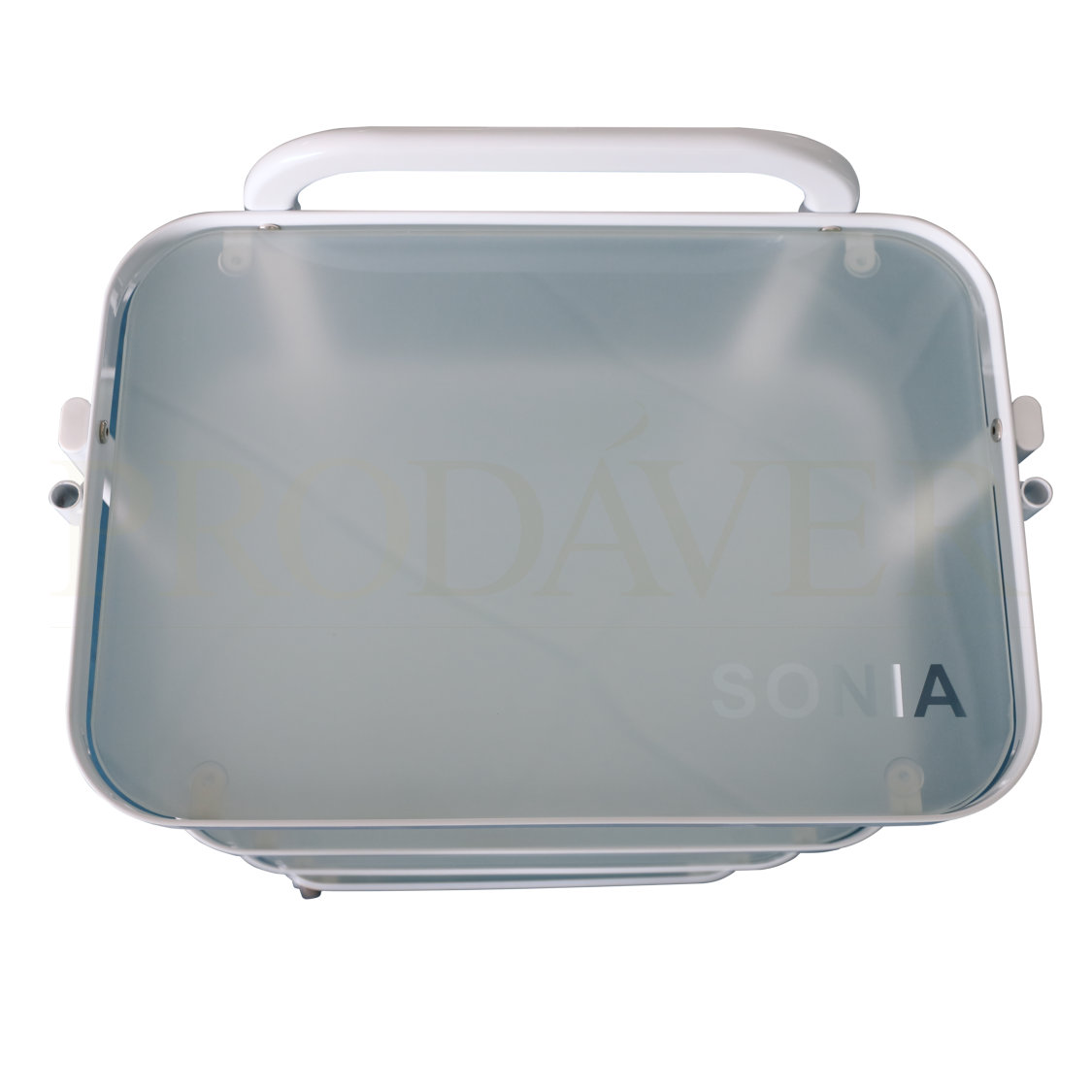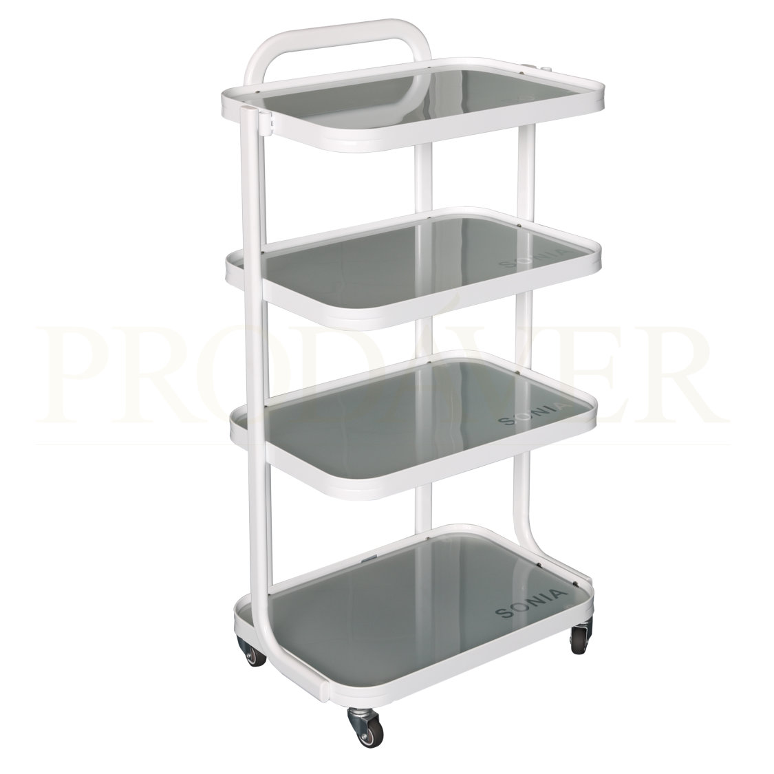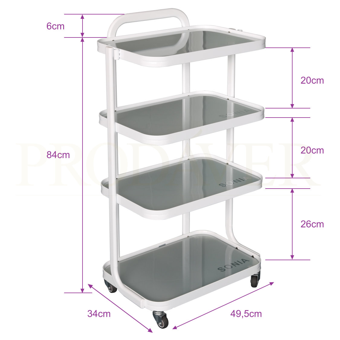 Mesa com estrutura metálica em cor branca e com 4 prateleiras em vidro. As prateleiras de vidro têm duas faces diferentes, uma é lisa com brilho e a outra é áspera e fosco. O lado fosco é o que assenta em cima das ventosas, caso tenha de mover a mesa o vidro não quebra com facilidade. Nas duas laterais da prateleira superior tem um suporte onde pode encaixar uma lupa ou um candeeiro. Contém uma pega na parte de trás para mover a mesa se houver necessidade, que faz com que seja como um trolley. Inclui 4 rodas sem travão. Dimensões da mesa: 84cm altura (até à prateleira superior) x 34 cm largura x 49,5cm comprimento. Dimensões da prateleira em vidro: 31,2cm de largura x 44,5cm de comprimento. Prodáver.